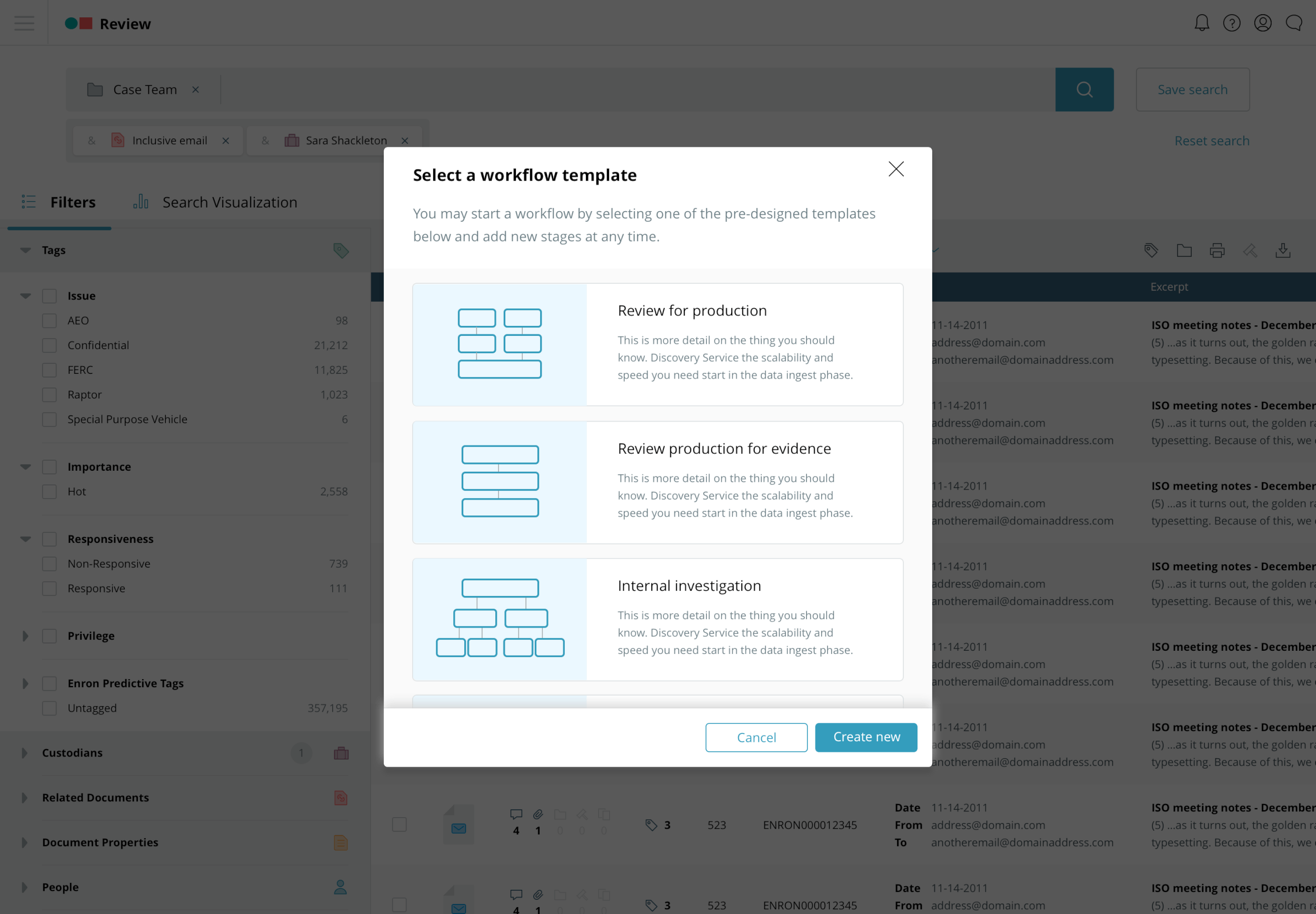 DISCO brings artificial intelligence, cloud computing, and data analytics to the practice of law so attorneys can focus on what matters most: securing justice for their clients and winning the most important disputes in the world. Workflow is the feature used to organize and review documents for cases.
