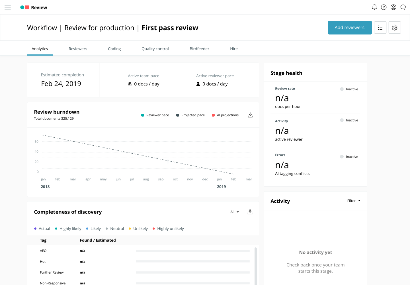 The feature that was most requested was to have more insight into the review process as a whole. Workflow had metrics but they were disjointed, complicated, and missing pieces. We looked for core metrics that would deliver value to the team daily while also providing clarity to the attorney team on the status of the review.
