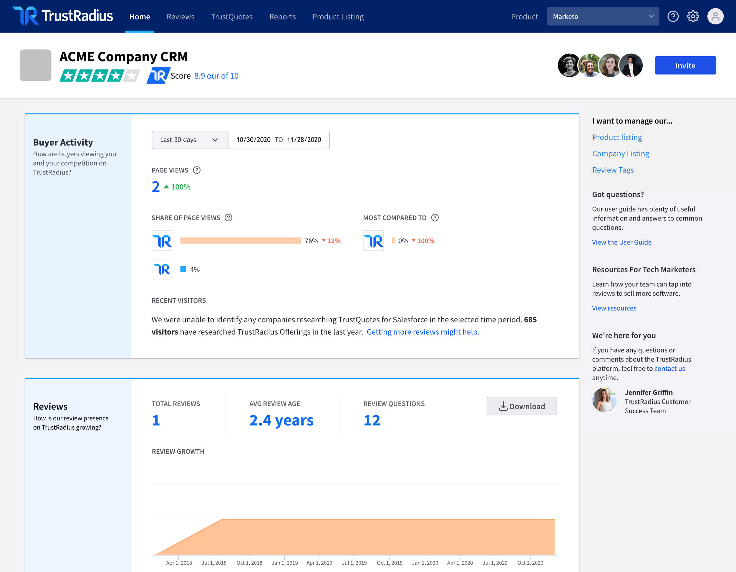 TrustRadius is a buyer intelligence platform that partners with software companies to drive user reviews, generate intent signals on in-market buyers looking for the best fit for their software needs, and understand their business and position in the market vs their competitors. As the market has continued to grow, so has the need for a service to help buyers and vendors connect meaningfully.
