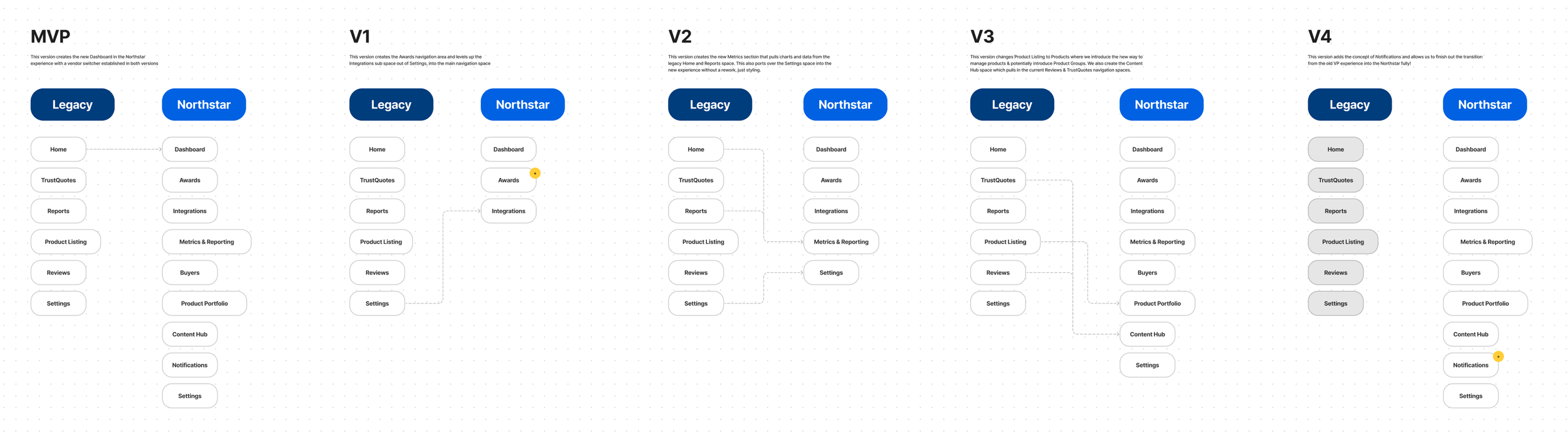 With the new experienced outlines, we focused on how we would iteratively provide value to customers while making updated to the experience and the tech. With this approach, we could avoid trying to rebuild the entire experience for years in the background. By partnering with internal stakeholders and leveraging our user feedback, we defined the stepped approach to our vision for the vendor experience.