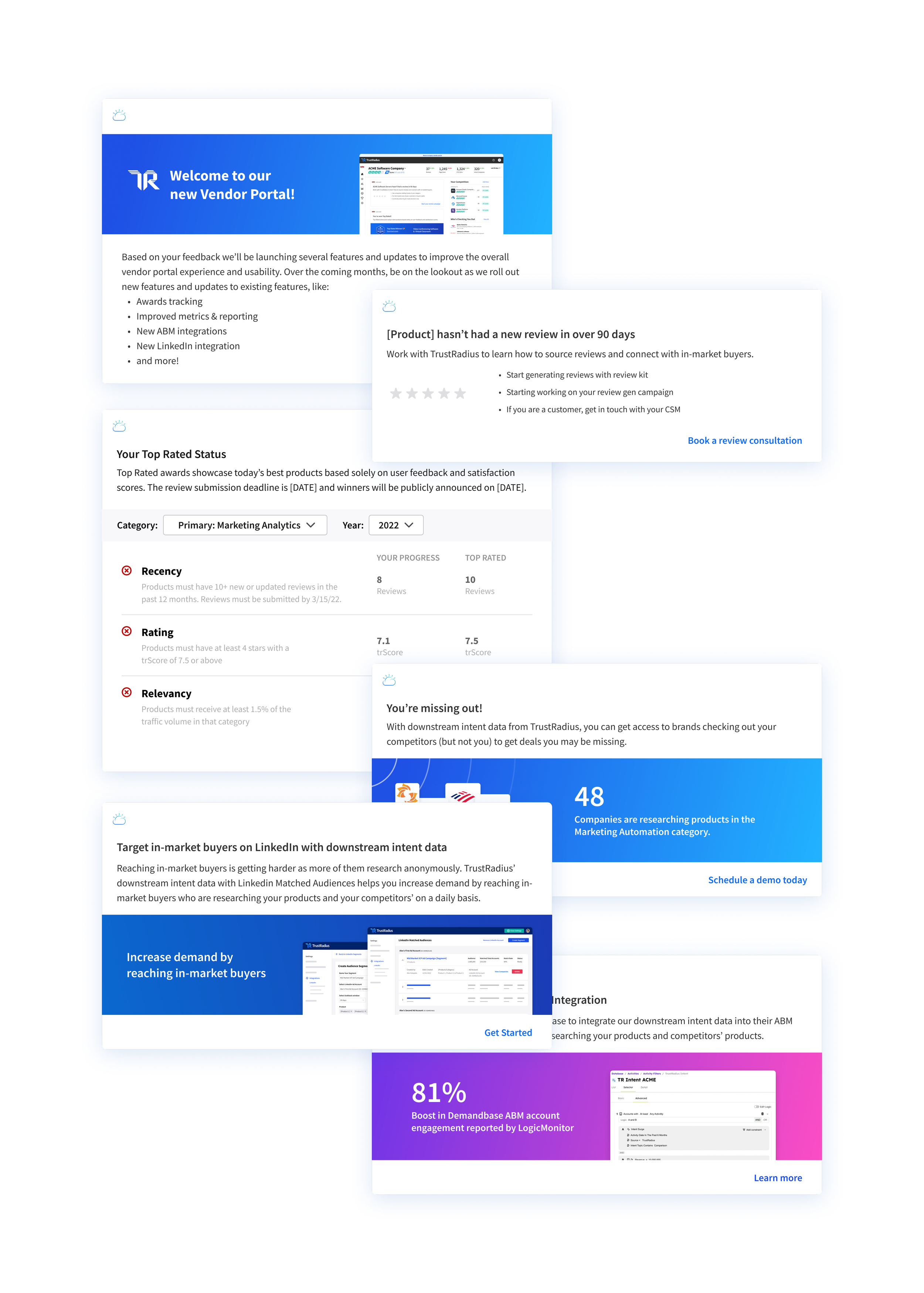 Create a frictionless experience that delivers real value and information to vendors, improving customer retention and creating more growth opportunities because vendors will be able to see and assess the value of working with TrustRadius.
